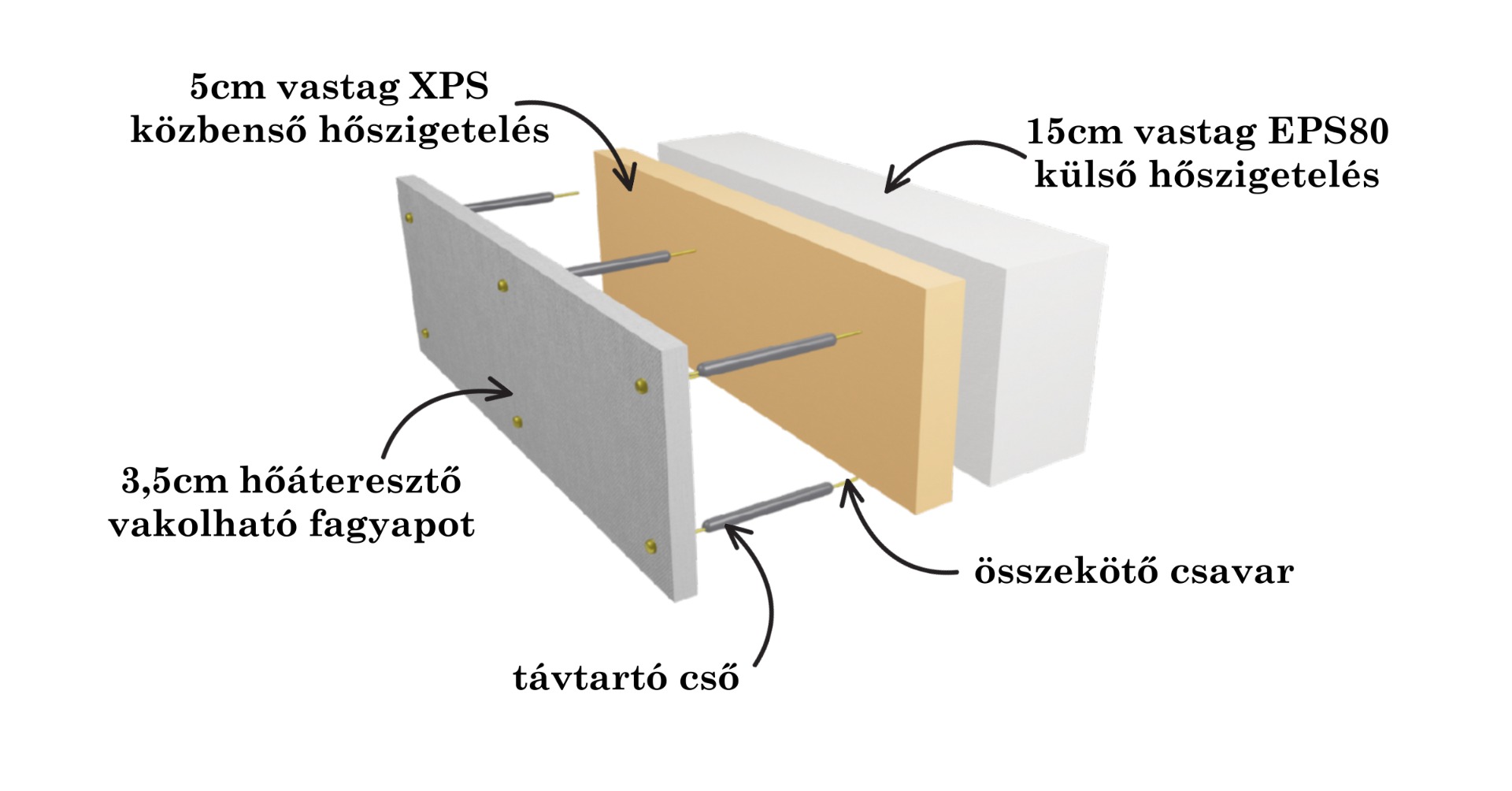 A termék lényege, hogy nem elszigeteli a tartószerkezetet a belső tértől, hanem tudatosan kihasználja a vasbeton hőtároló tömegét, miközben a teljes szerkezet hőhídmentes marad.